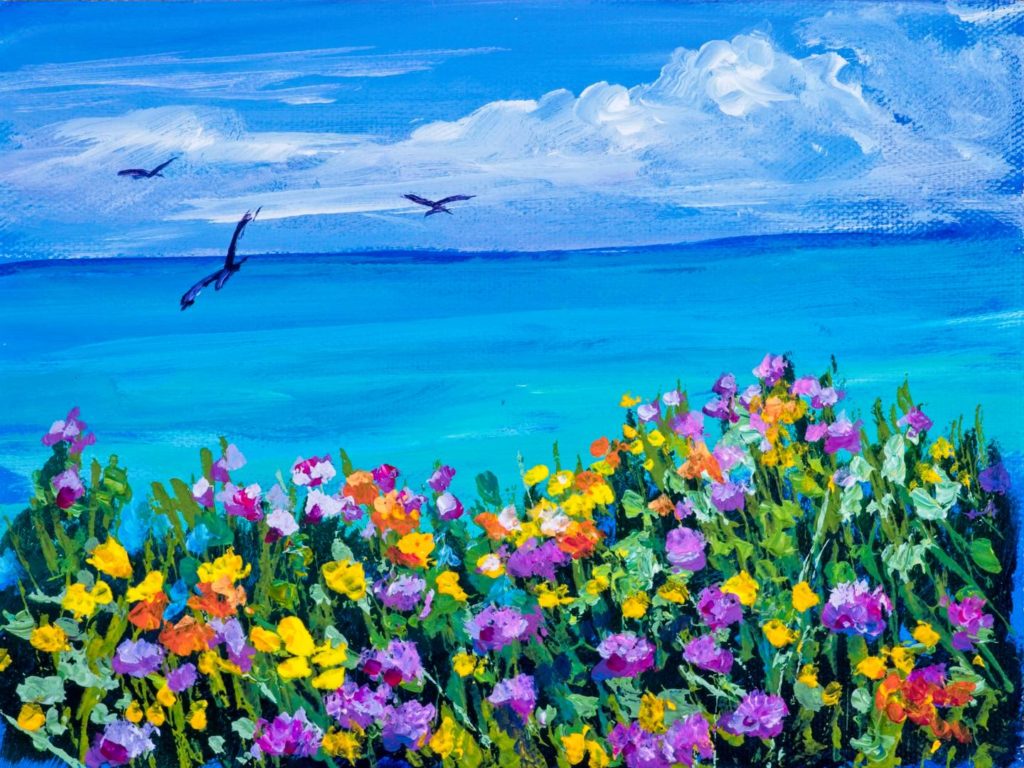 Colorful Yellow and Purple Flowers by the Sea